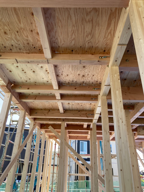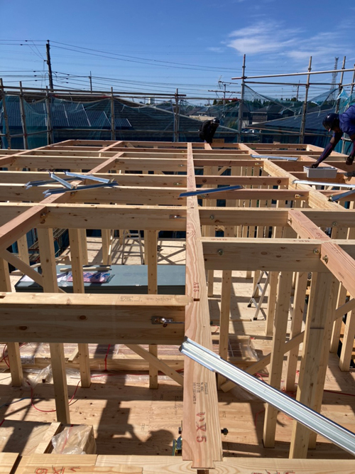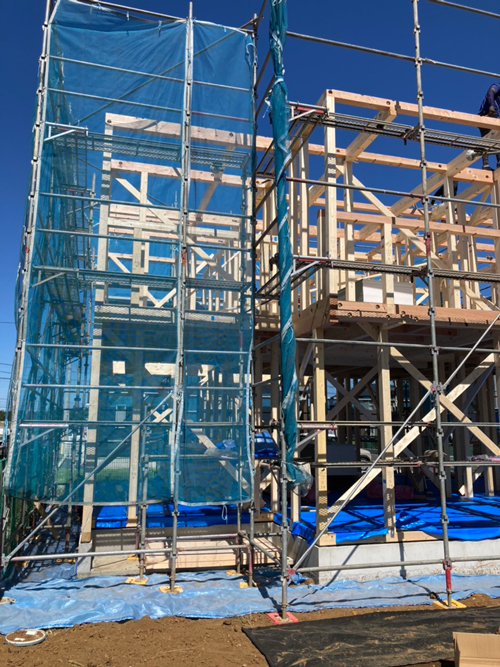写真を撮影したのはお昼前でしたが大枠は2階部分まで組み上がっていました!大工さんも手際よく作業していて、見ていて楽しかったです(^O^)足場に登って上からも撮影させて貰いました!