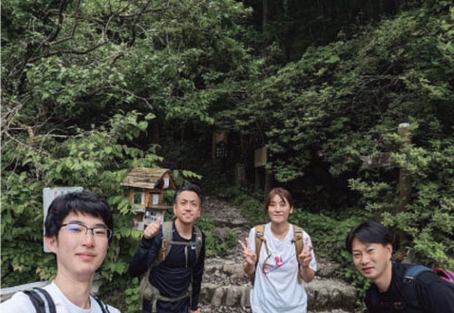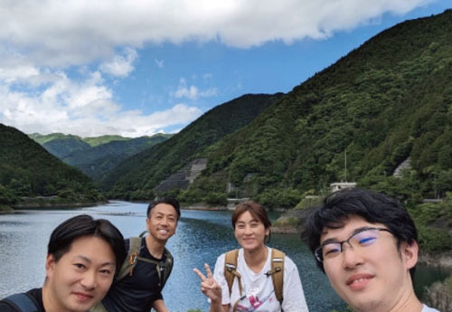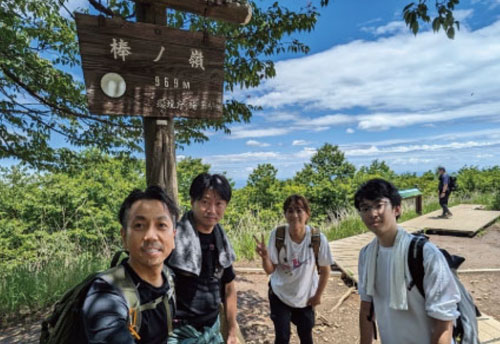快晴の空の下、会社の仲間3人と一緒に