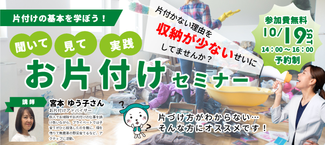 エステージでは10月19日(土)にお片付けセミナーを実施いたします。講師にお片付けアドバイザーの宮本ゆう子さんをお迎えし、実践を交えながらお片付けを基本から学んでみませんか。