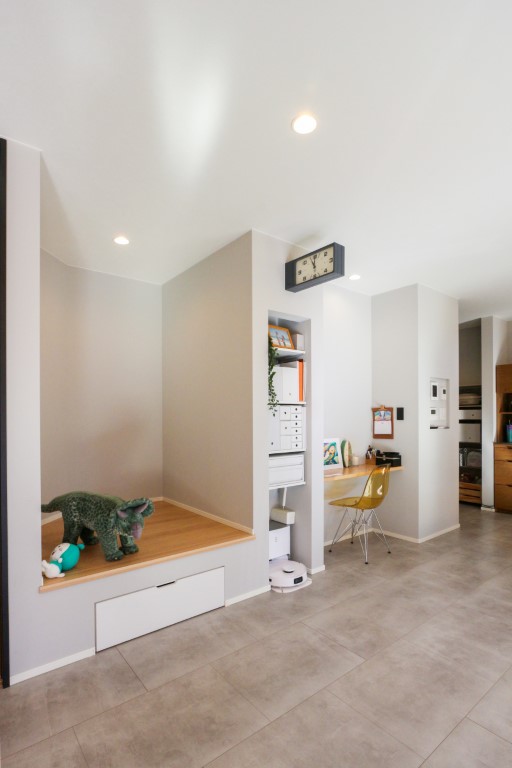 小さなお子さまがいるご家庭や、在宅ワークと家事を行き来しながら過ごす方には、リビングの一角にワークスペースをつくるプランも人気です。完全な個室まではいかなくても、壁や本棚、ガラスパーテーションなどでゆるやかに区切ることで、視線と音を少しだけコントロールできます。