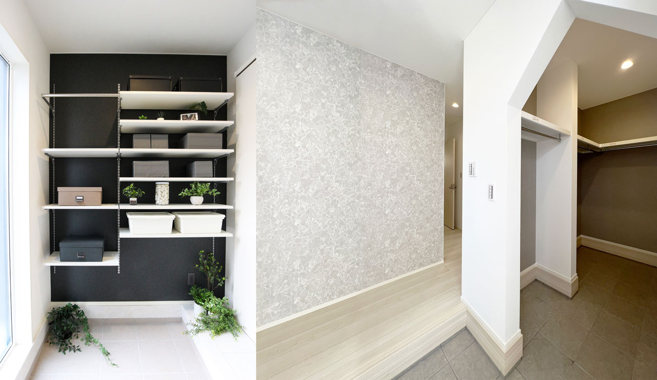 大容量シューズクロークと、コートなどを収納できるクロゼットがあるエントランスでお出かけ用品を管理すれば、身支度も楽々な上、コートについた花粉などの汚れを室内に持ち込みません。