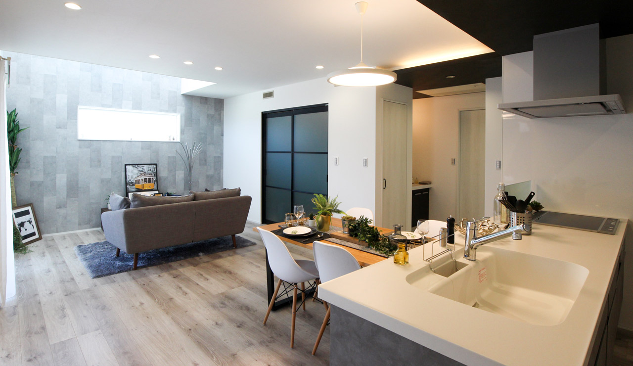 対面式のキッチンからはダイニングとリビングを一直線に見渡すことができるため、小さなお子さまのいるご家庭も安心して家事ができる設計です。