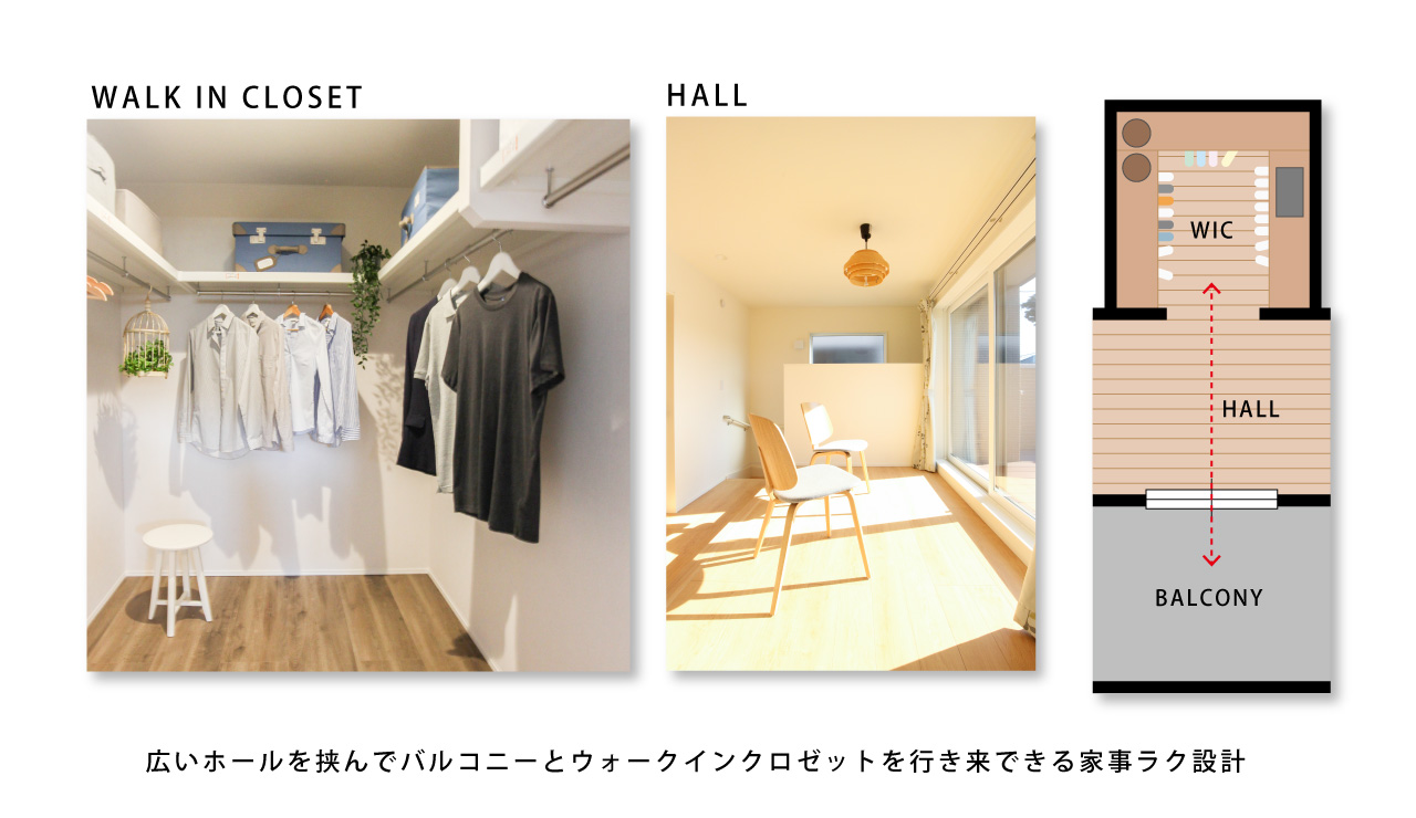2階に上がると、バルコニーに面して大きなホールがあり、ホールを挟んで向かい側には乾いた洗濯物をすぐに収納できるウォークインクロゼットがあります。家事動線がシンプルな考えられた間取りです。
