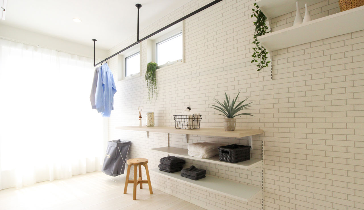 雨の日や花粉の時期に大活躍するサンルームをランドリーに隣接させた家事ラク設計。