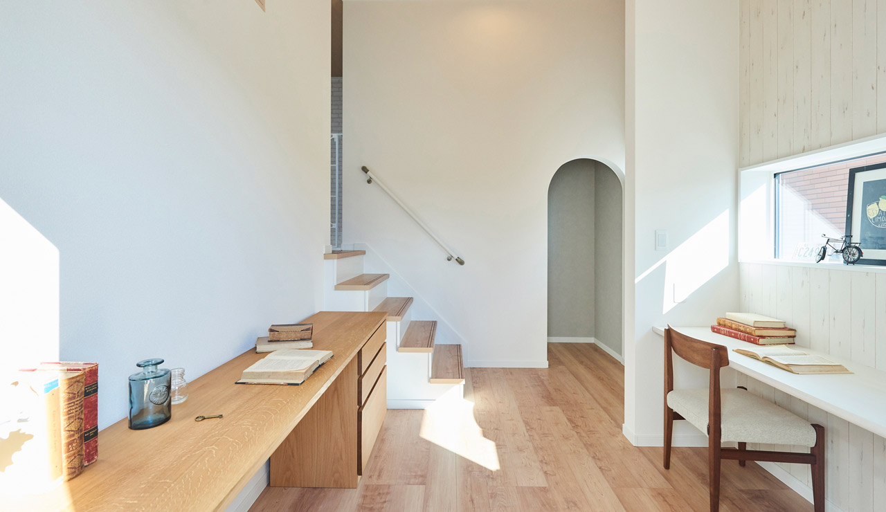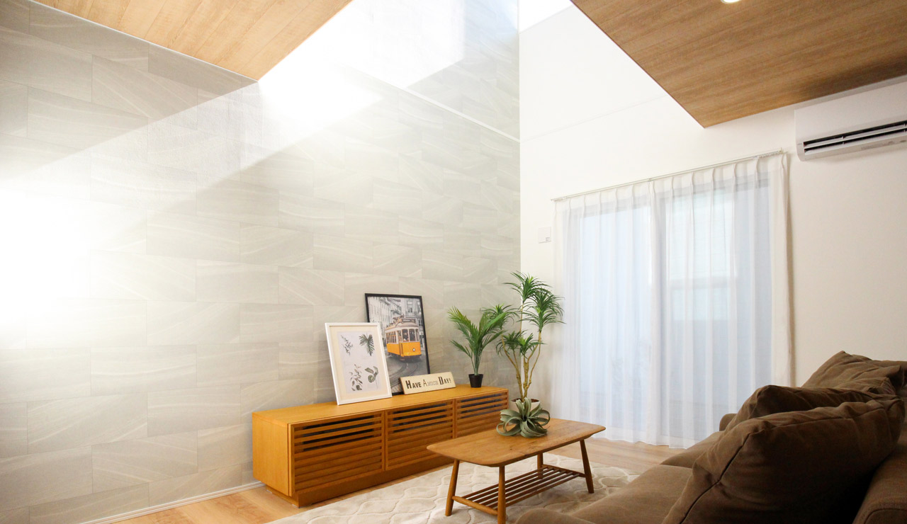 開放的な吹き抜けには、光をたっぷりと取り込む大きな採光窓がり、リビングを明るく照らしてくれます。