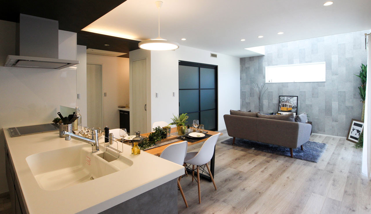 対面キッチン・ダイニング・リビングが一直線に並んでいることで、キッチンから家族の様子がうかがえる安心設計。