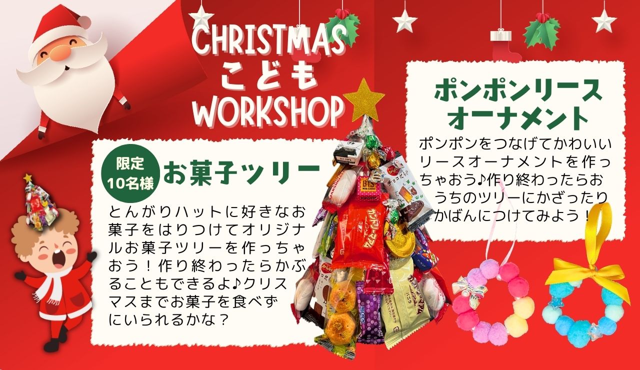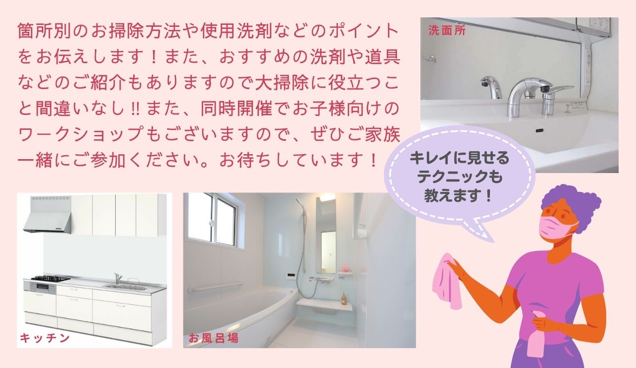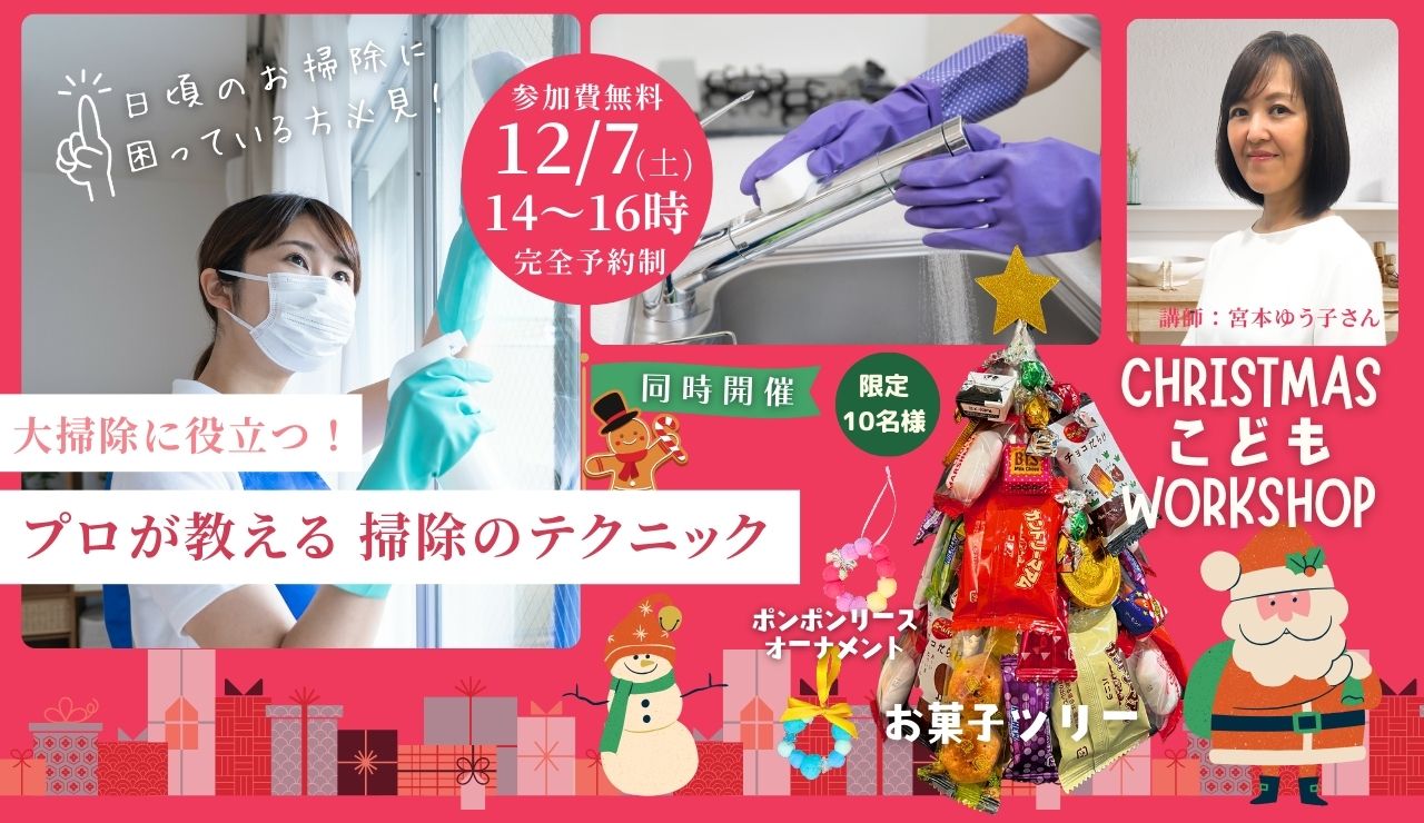 クリスマスこどもワークショップ出を作るためのワークショップを開催します!お子様が夢中になって創作活動に取り組んでいる間、親御さんはお掃除セミナーに参加して、効率的なお掃除テクニックを学ぶチャンスです。お互いに充実した時間を過ごしましょう!