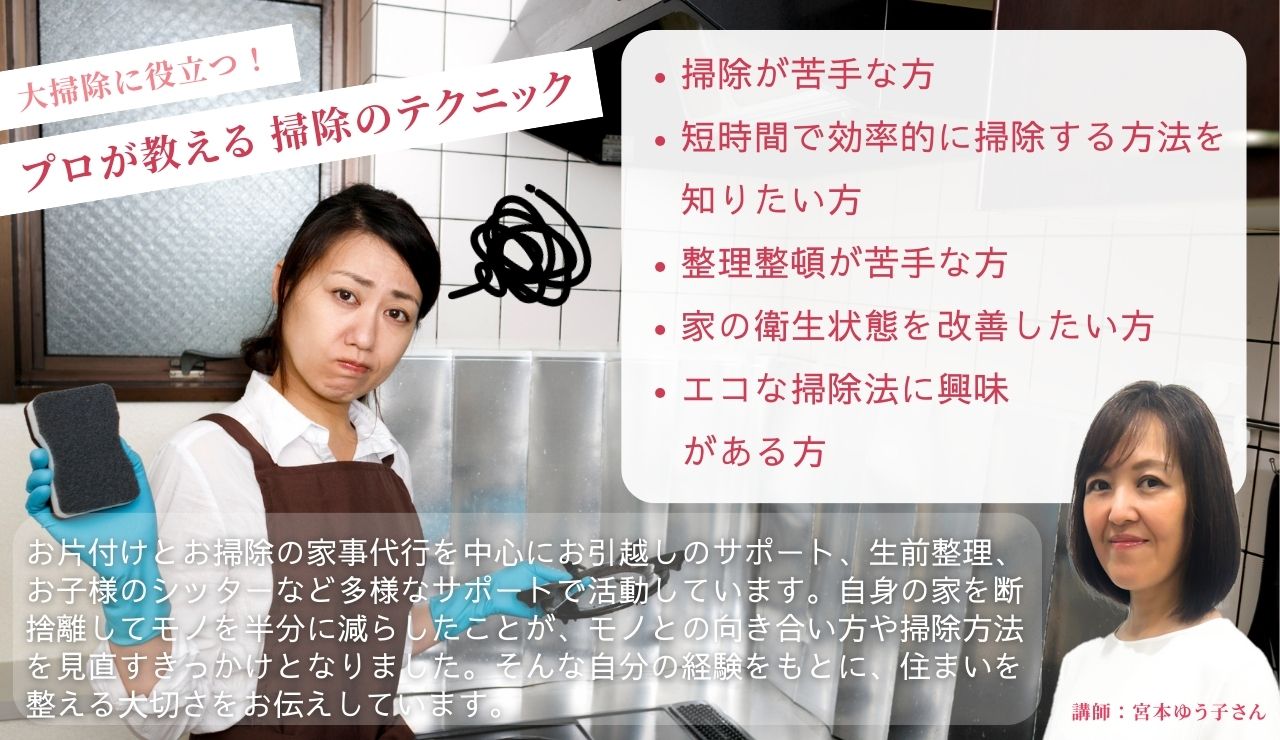 今回のセミナーでは、効率的なお掃除方法をお伝えいたします。清潔で快適な生活空間を作り出し、健康を促進するためのヒントをお届けします。掃除を通して、皆様の快適で健康的な生活をサポートできればと思っています。さらに、参加者同士の交流を通じてコミュニティを形成し、新たなつながりを作ることも大切な目的です。ぜひこの機会にご参加いただき、共に学び合いましょう!お待ちしております。