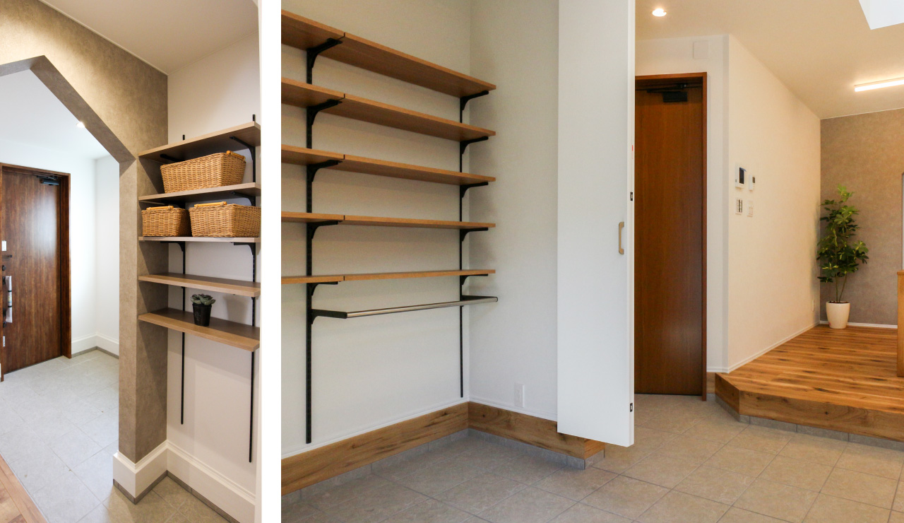 SIC(シューズインクローゼット)付きの玄関は、収納力も抜群。造作壁の柔らかなラインが、訪れる人をそっと迎えます。
