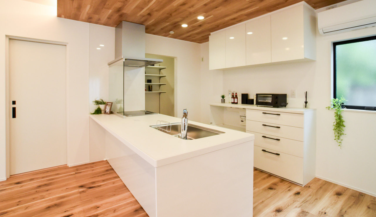 開放感あるキッチンに、使い勝手の良いパントリーとカップボードをプラス。生活感を隠しながら、日々の動線が整う快適設計です。