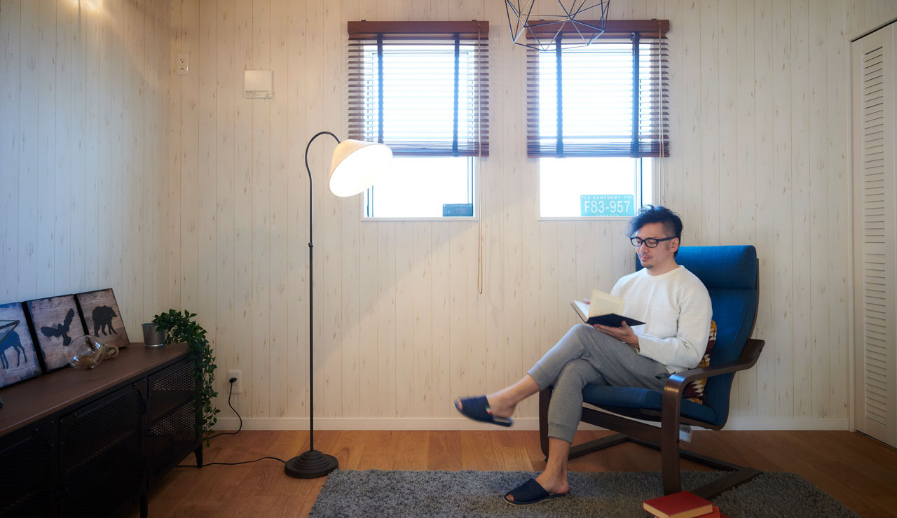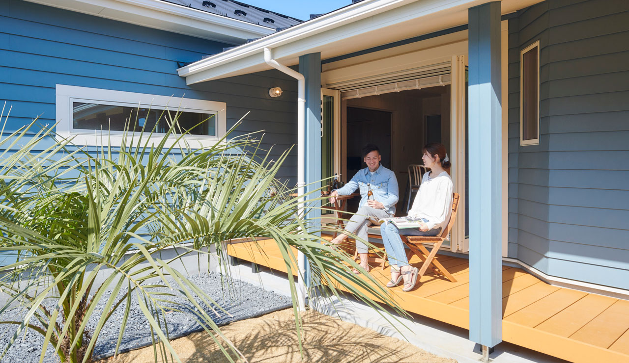 リビングの開口窓の先にはゆったりと外を眺めながら読書やおしゃべりも楽しめるカバードポーチがあります。