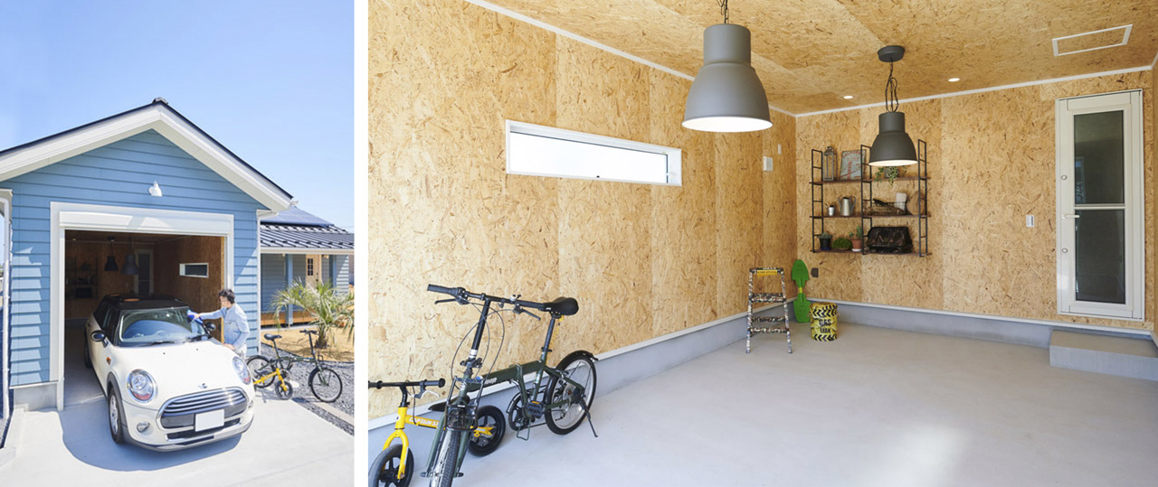 趣味のガジェットや自転車を収納する事も出来る遊び心と機能性を備えたガレージです。 -
