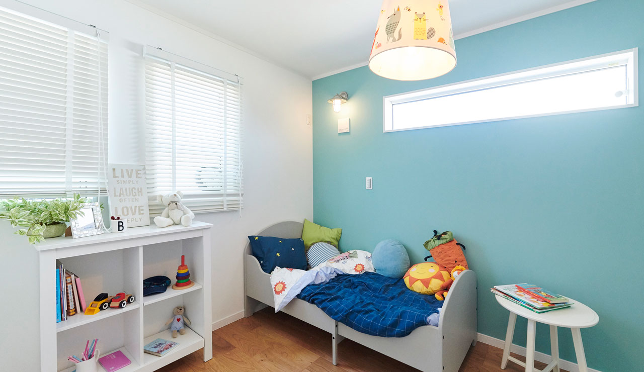 マリンブルーのアクセントクロスが可愛らしい子ども部屋