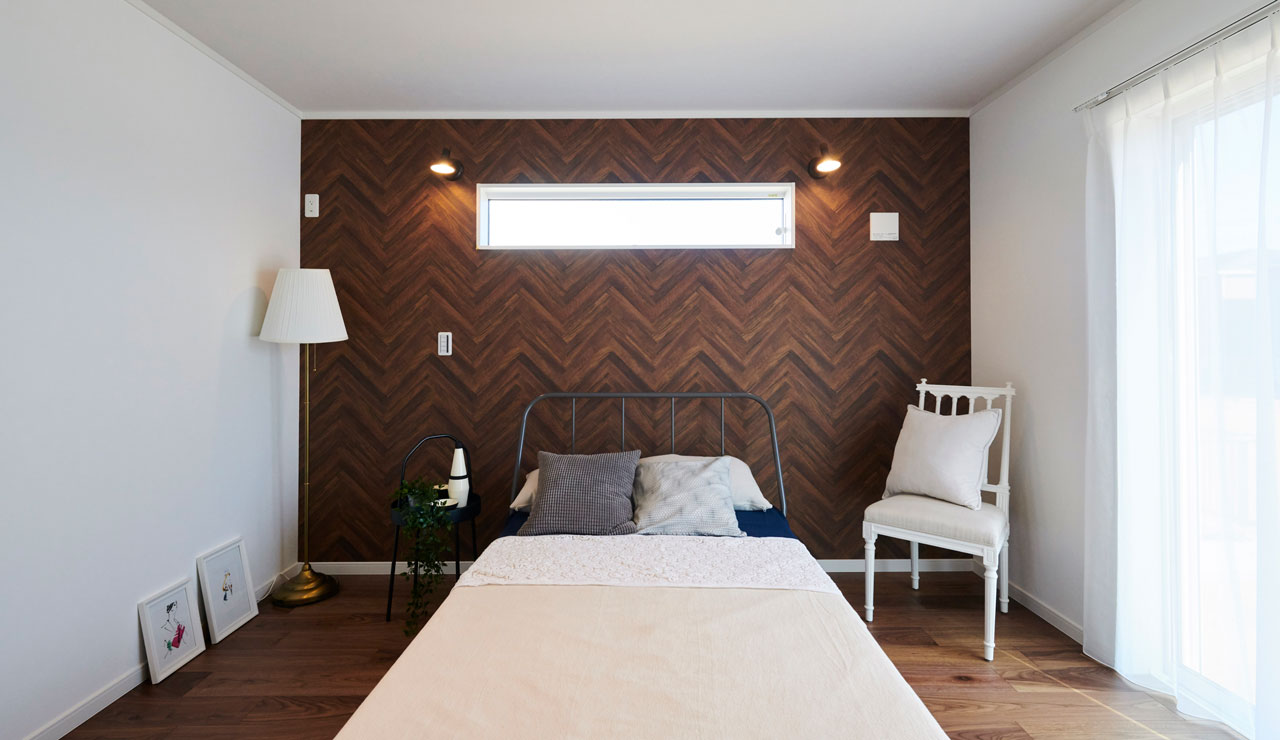 ヘリンボーンのアクセントクロスが落ち着いた印象の主寝室