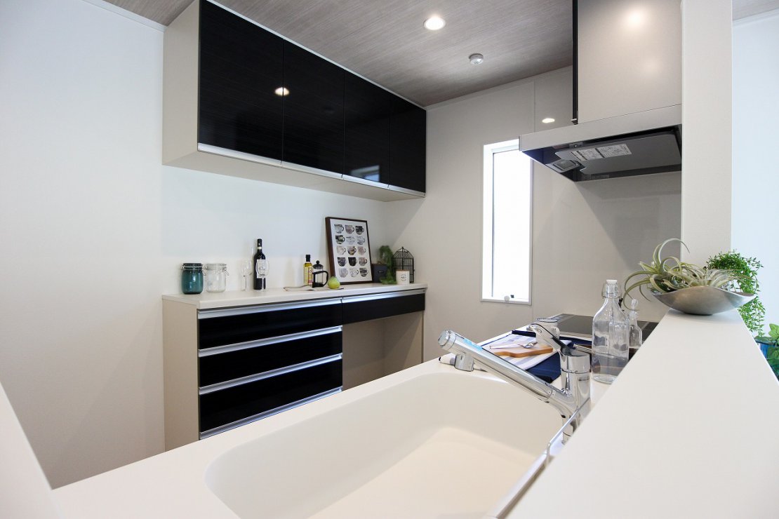 対面キッチンからはリビングダイニングを見渡すことができるため、