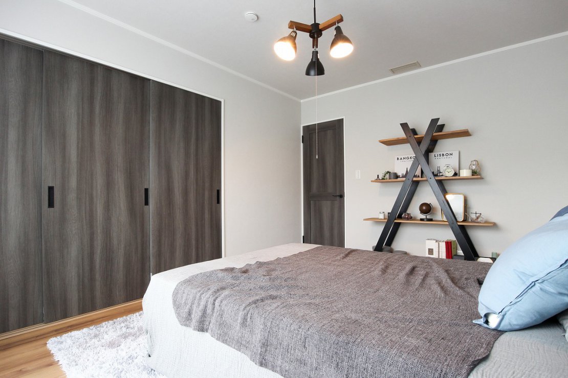 主寝室の収納と扉はグレーに統一し、落ち着いた空間を演出