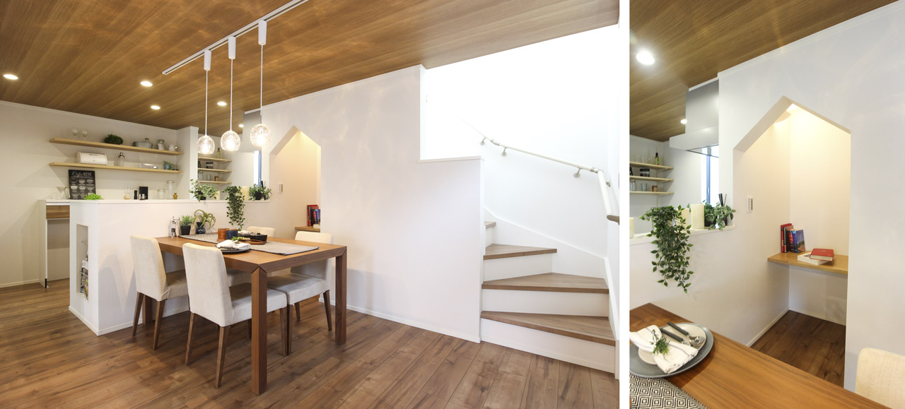 三角屋根のようなアーチがアクセントのカウンターはワークスペースやお花や雑貨を飾っても○。 -