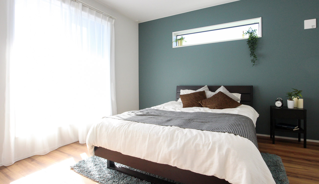 おちついた深みのあるアクセントクロスは寝室でのリラックスタイムをより豊かなものにしてれます。