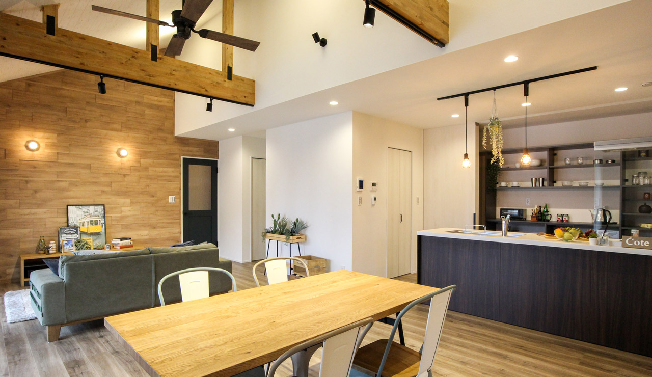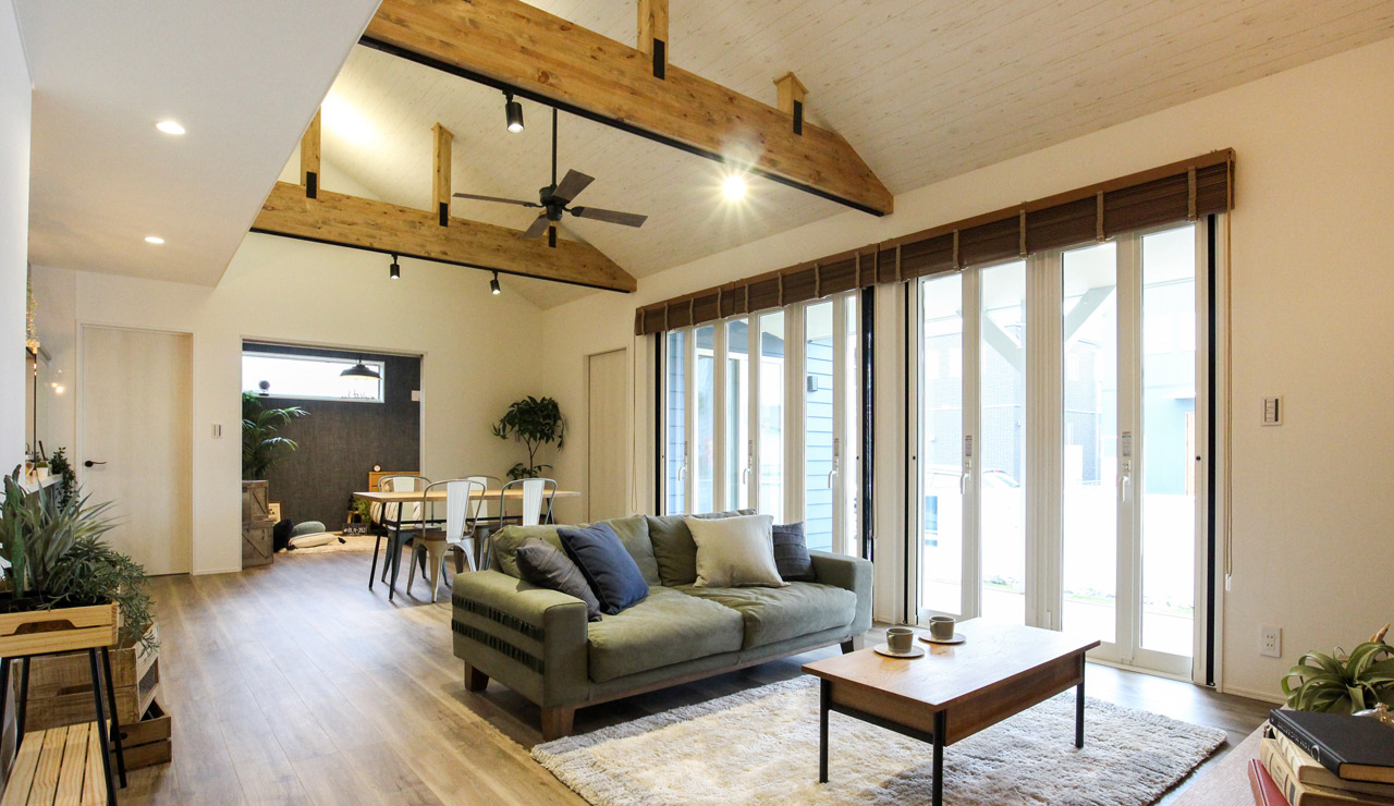 高い勾配天井と化粧梁が印象的なリビングダイニング。大きな開口窓はカバードポーチ(ウッドデッキ)へと続いています。