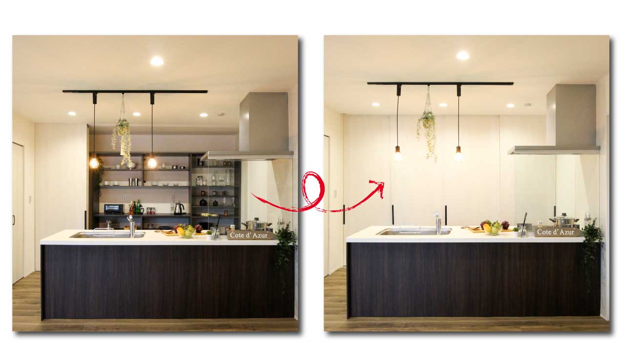 キッチンの背面収納はスライドドアで収納棚と冷蔵庫をすっぽりと覆い隠すことができ、急な来客にも安心です。