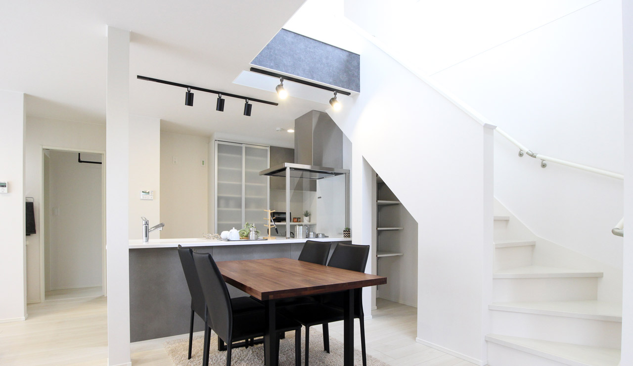 グレー×ホワイトを基調にした配色とライティングがワンランク上の上質なリビングを演出しています。