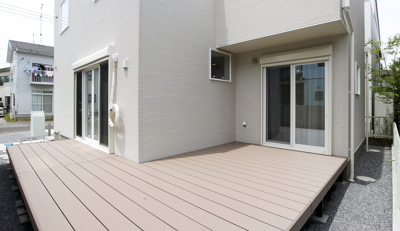 1階洋室とリビングにつながるウッドデッキは、家族でBBQをしたり大きな洗濯物をたっぷり干すのにも重宝されます。