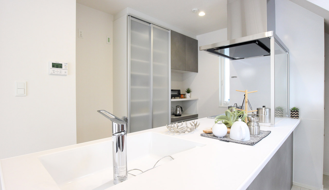 備え付けの大きな背面収納は大容量なので、食品のストックや食器もすっきりと収納できます。