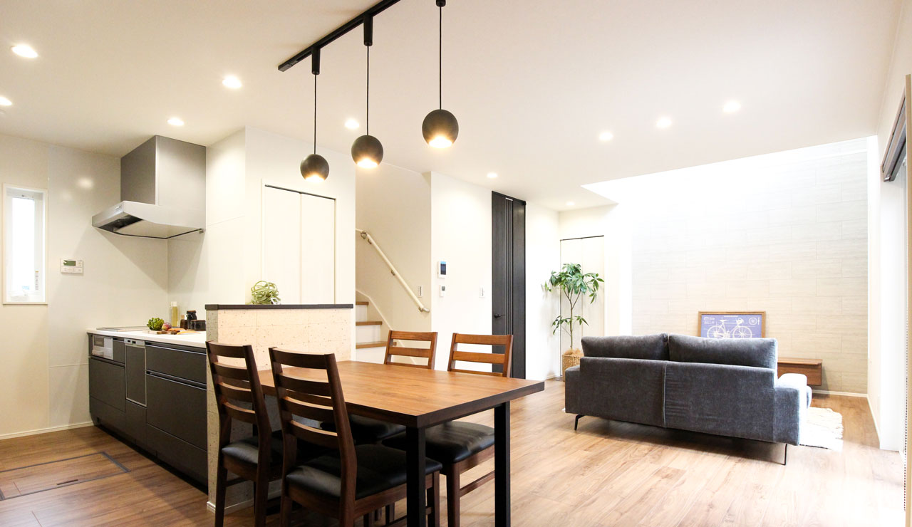 ダイニングはキッチンと横並びになっているため、家族が自然と料理の配膳や片付をお手伝いできる設計で家事ラク同線として人気も高い間取りです。