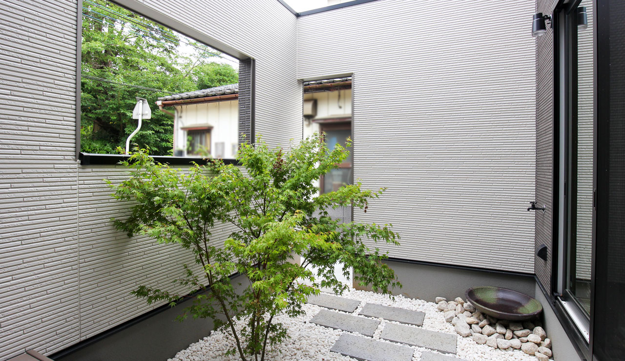 中庭はリビングと和室の大きな窓に面しており、それぞれの部屋から眺めることができます。 -