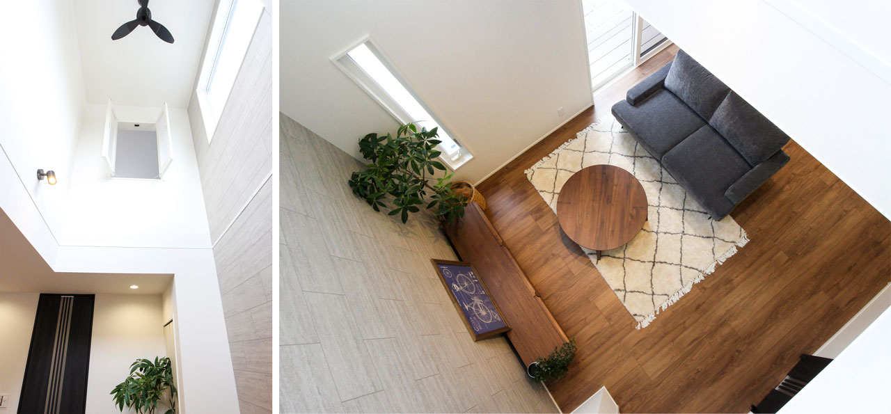 吹き抜けにある大きな窓からの光を、リビングと洋室に届けることができるため、