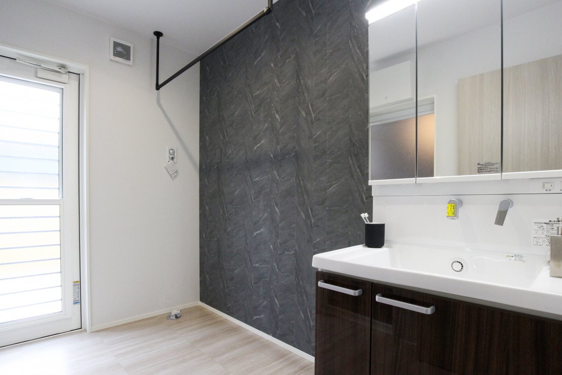洗面脱衣室には室内乾燥もできる備え付けのハンガーパイプがあり、雨の季節や花粉の季節に重宝されます。