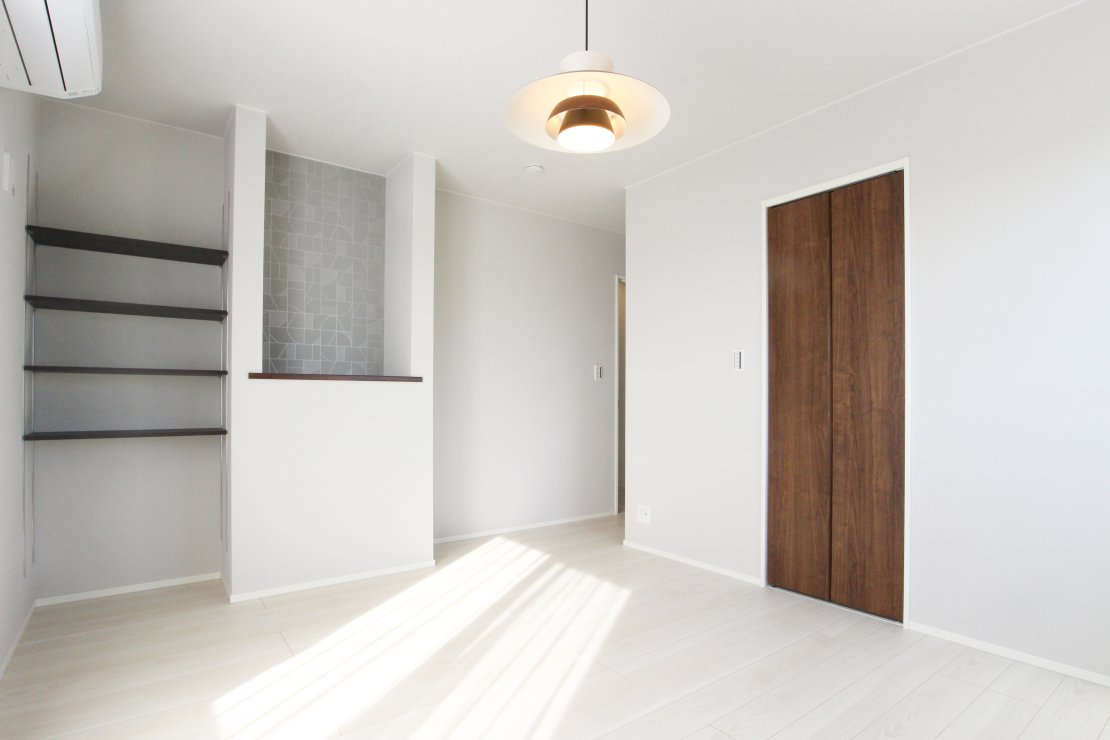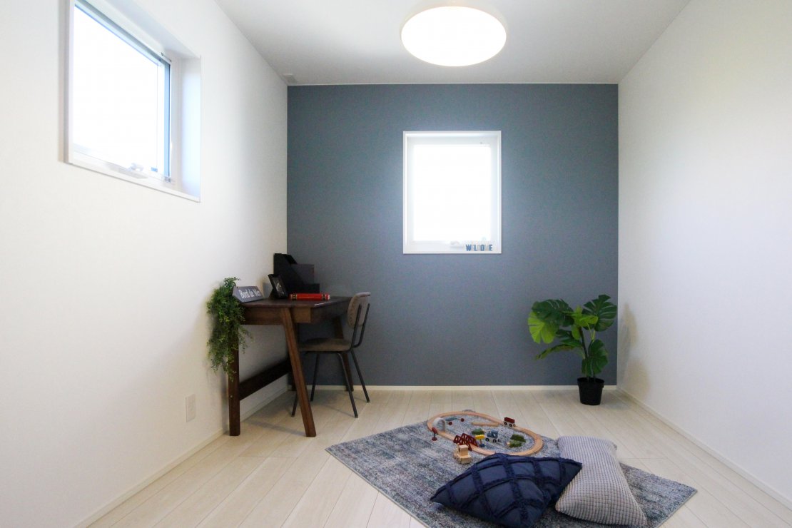 スモーキーなブルーのアクセントクロスと小窓が印象的な洋室2はお子様のお部屋にもぴったりです。
