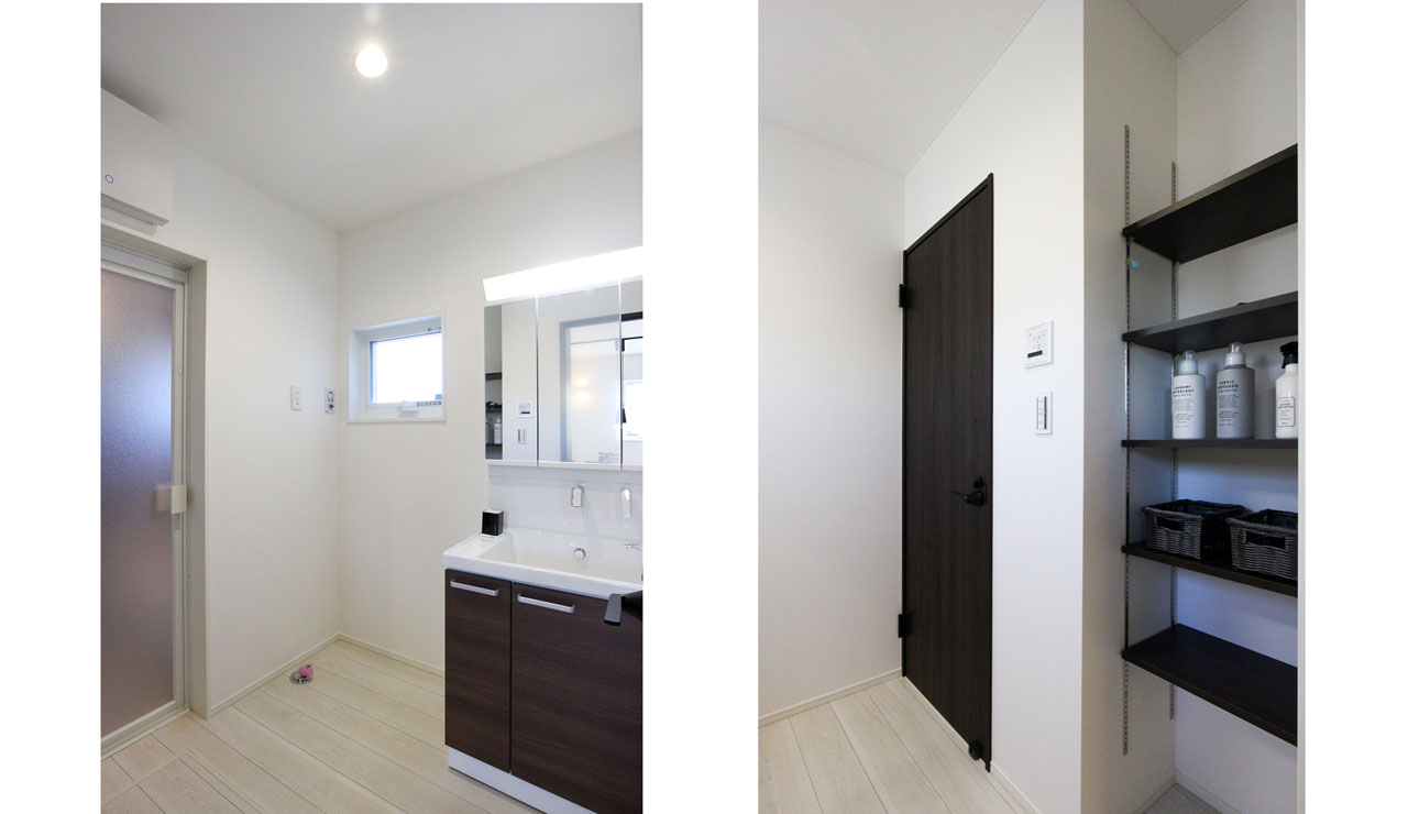 サニタリールームには可動式の棚がついており、収納力も抜群です。