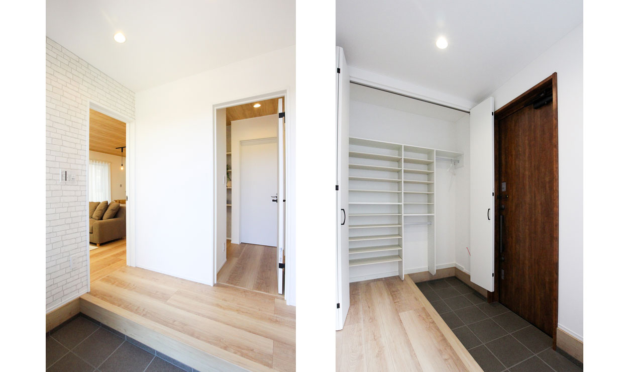 大容量のシューズインクロークはアウトドア用品やゴルフバック・ベビーカーなど大きなものもたっぷりと収納することが出来ます。