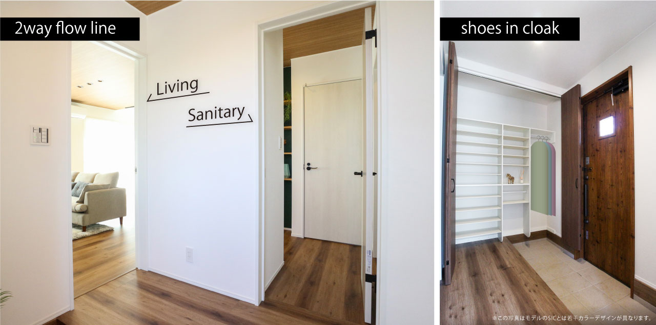 エントランスはリビングとサニタリースペースの2か所に直接アクセスできる2way動線。