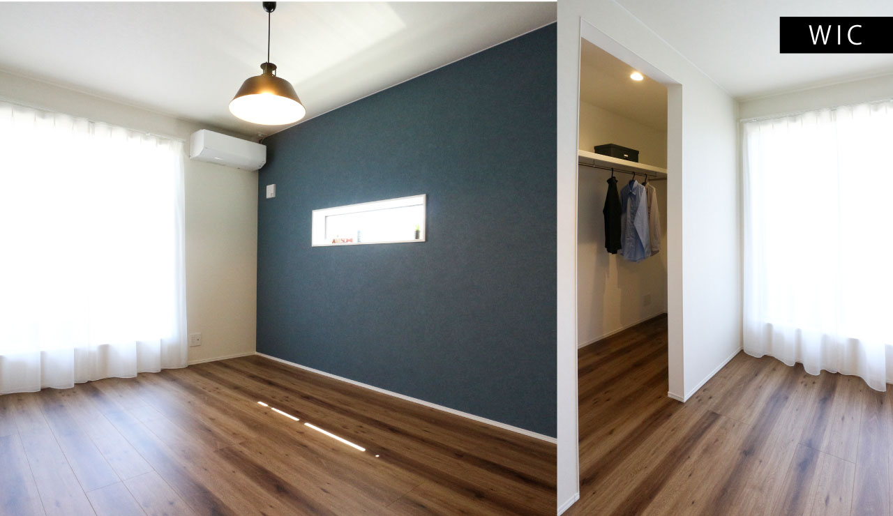 主寝室は落ち着いたブルーグリーンのアクセントクロスで就寝時に心をリラックスさせてくれます。