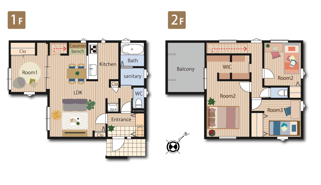 リビングと洗面スペースにつながる2つの動線は、帰宅時は洗面スペースへ直行できるので、外の汚れを持ち込みません。 -