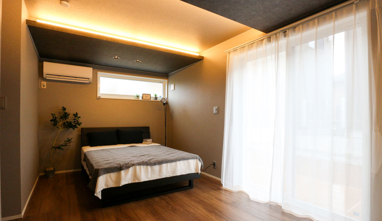 広々とした主寝室は落ち着いた配色と間接照明がリラックス空間を演出。