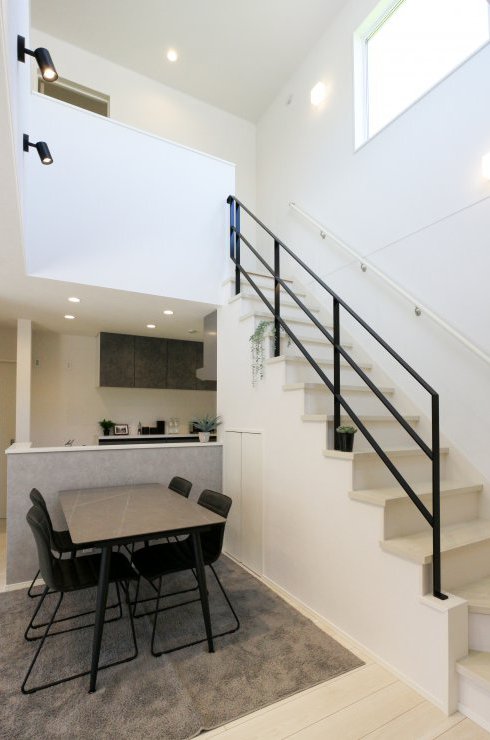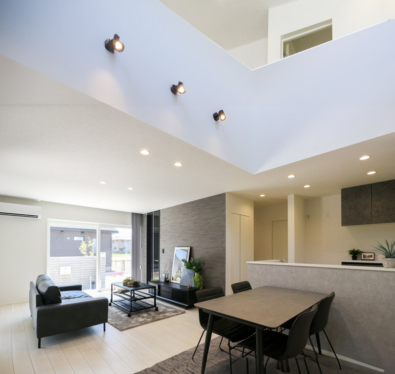 ダイニング上部を吹き抜けにすることで縦の空間が広がり、開放的な空間を演出しています。 -
