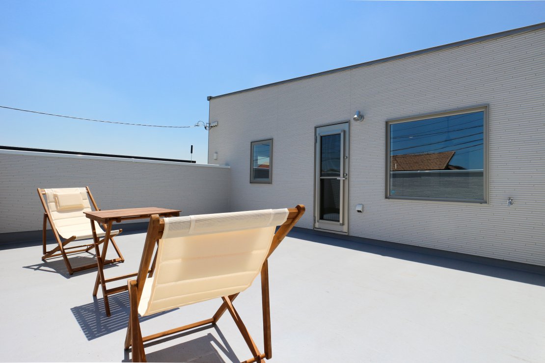 ガレージの上部は青空が広がるルーフバルコニーになっており、たくさんの洗濯物を干すのはもちろん、お子様と水遊びをしたり、家族でBBQもできる十分な広さがあります。