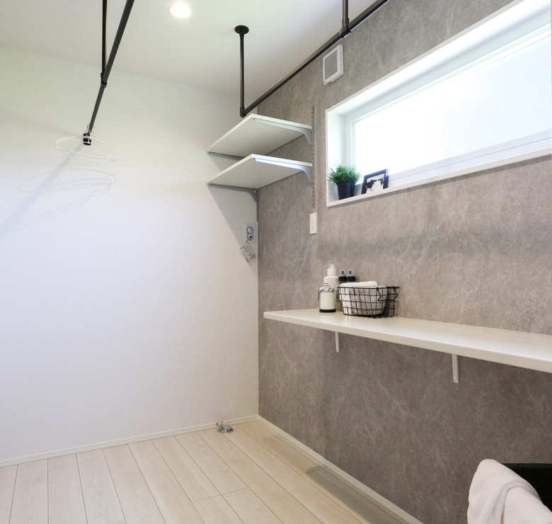 ランドリールームには洗濯を終えた衣類をすぐに干すことのできるハンギングバーが2つと、さらに浴室には乾燥機も付いており、雨の日や花粉の時期にもたっぷりと洗濯物を干すことが出来ます。