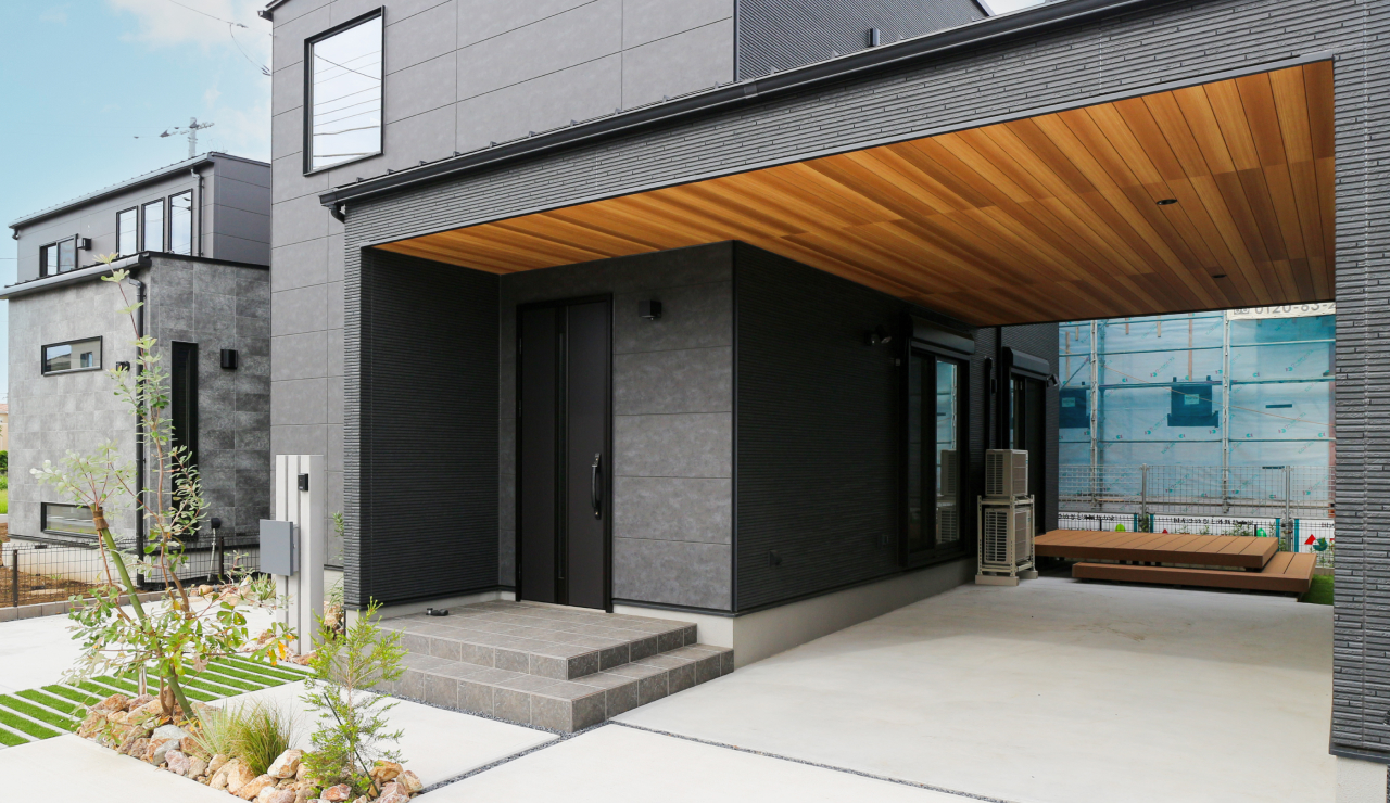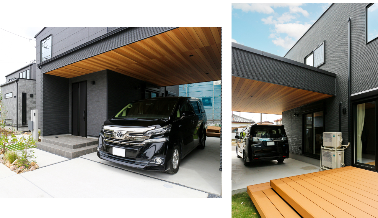 木目調の質感が映える屋根が、愛車を引き立てるスタイリッシュなガレージ。