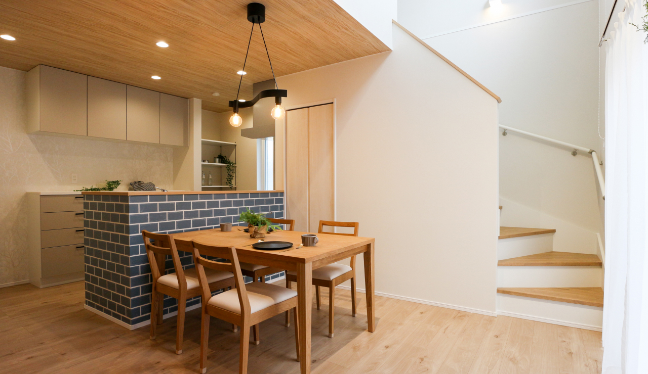 吹き抜けのダイニングと収納充実のキッチンで快適な暮らしを実現。