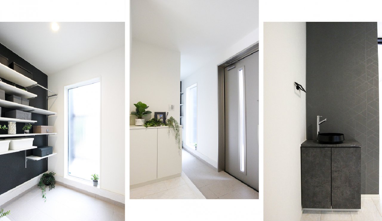 黒をアクセントにしたオープンな造作収納から、やわらかな自然光に導かれる廊下、そしてシックな手洗いカウンターへと続くスムーズな動線。