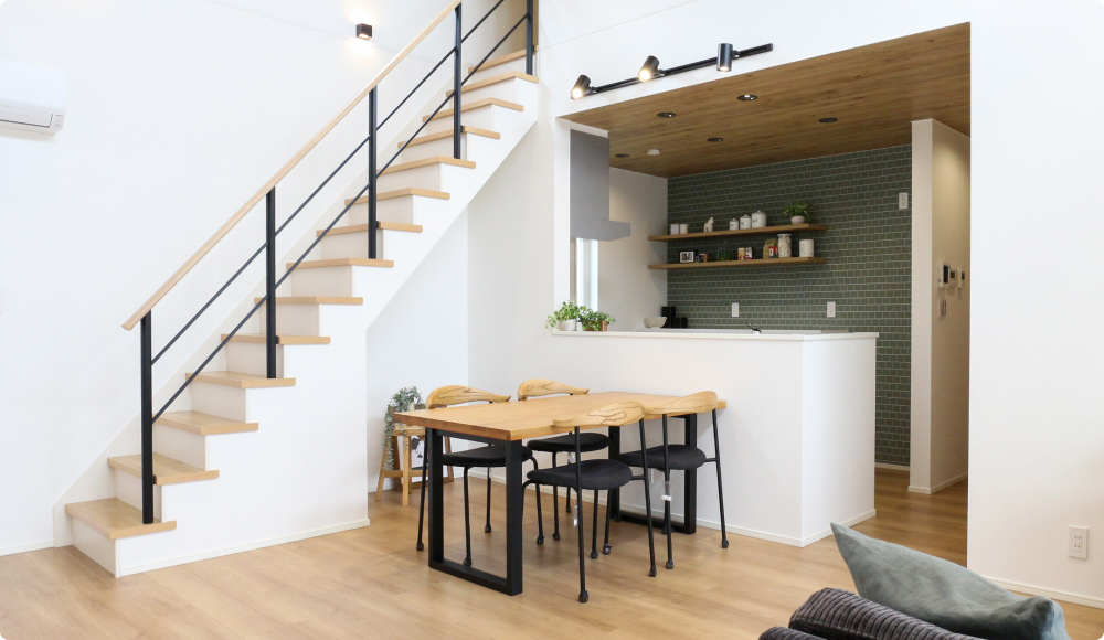 ロフトへと続く階段は、デザイン性と機能性を兼ね備えた美しいアクセント。シンプルながら存在感のあるフォルムが、空間に彩りを添えます。