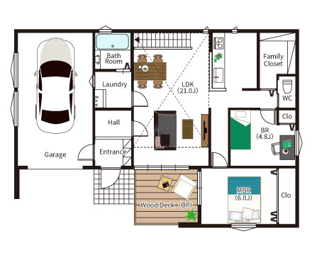 木目の扉は訪れる人をやさしく迎え入れ、リビングと繋がるウッドデッキは、自然の心地よさを住まいに届けてくれます。 -