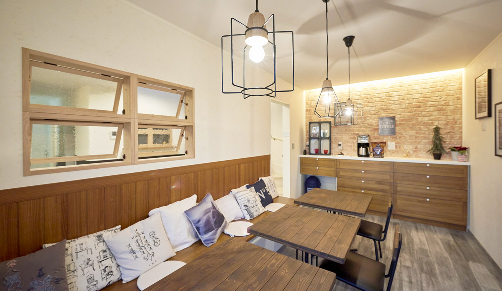 開放的なリビングと、キッチンカウンターにはカフェのようなオプション窓。