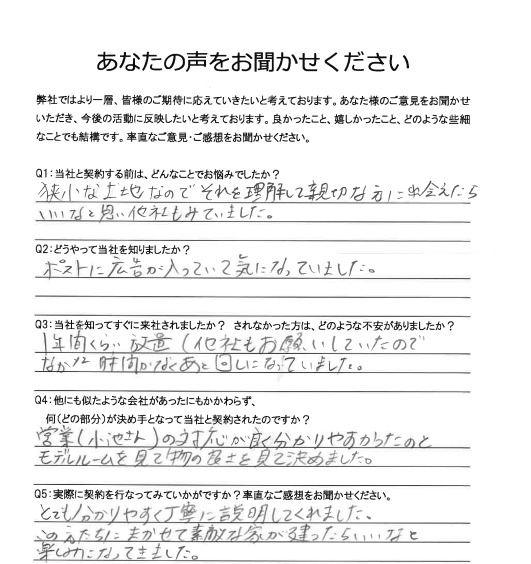 エステージでは、より良い家づくりを実現するため、お客様アンケートにご協力いただいております。注文住宅やリフォームに関するご意見をもとに、サービス改善に努めてまいります。ご協力ありがとうございました。