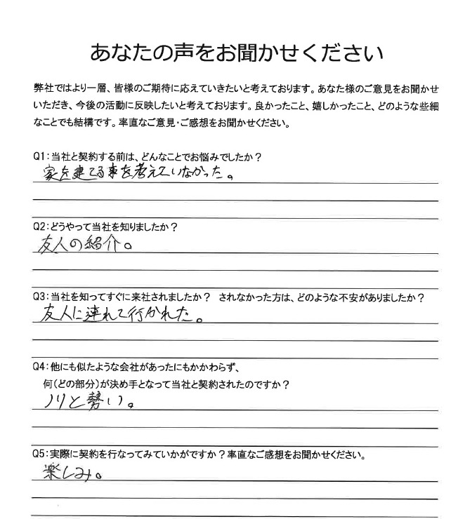 エステージでは、より良い家づくりを実現するため、お客様アンケートにご協力いただいております。注文住宅やリフォームに関するご意見をもとに、サービス改善に努めてまいります。ご協力ありがとうございました。