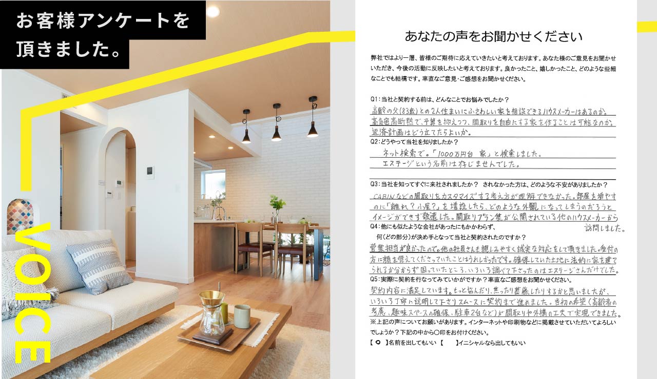 エステージでは、 より良い家づくりを目指し、お客様アンケートへのご協力をお願いしております。